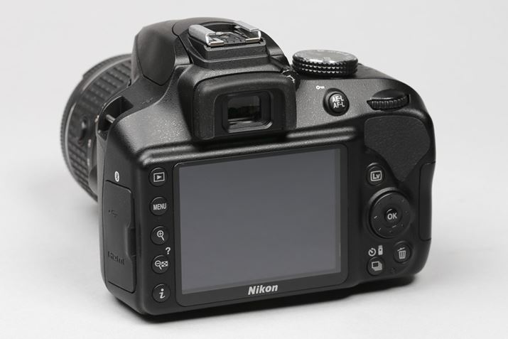 D3400の液晶モニターは3.0型固定式(約92万ドット)。上位モデルと同じように、モニターの左側にボタンが並ぶレイアウトになっています