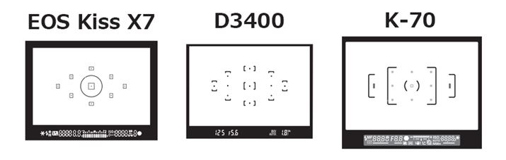 3モデルの光学ファインダー内のAF測距点は、いずれもひし形に配置されています。EOS Kiss X7とD3400は中央1点、K-70は中央9点がより高精度なクロスタイプのセンサーになります