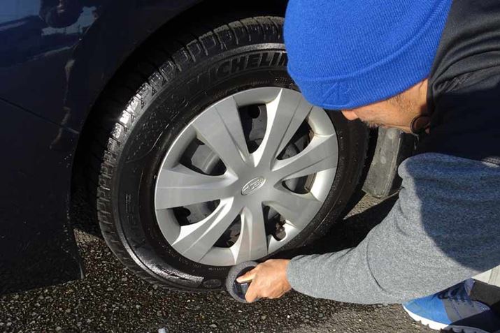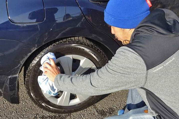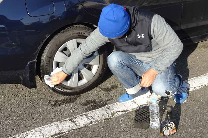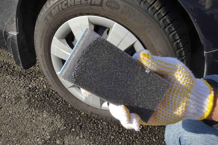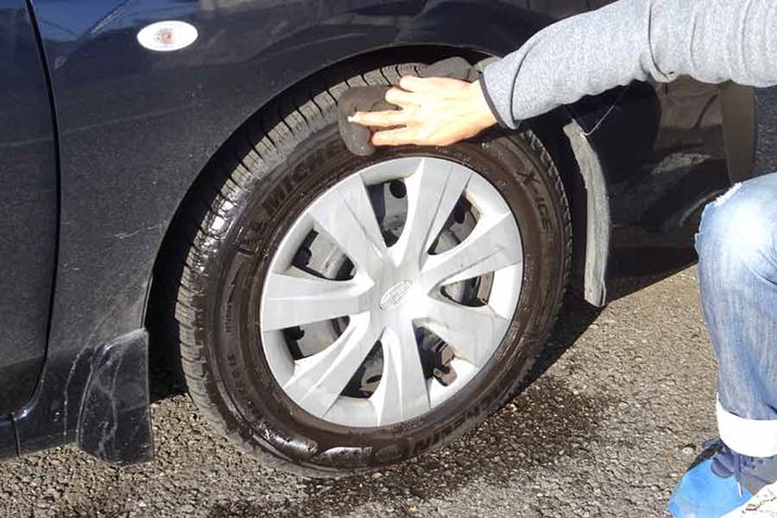 塗布前に、タイヤの汚れを取るため水洗いを。今回は簡易的に、水を含ませたスポンジで汚れを落としました