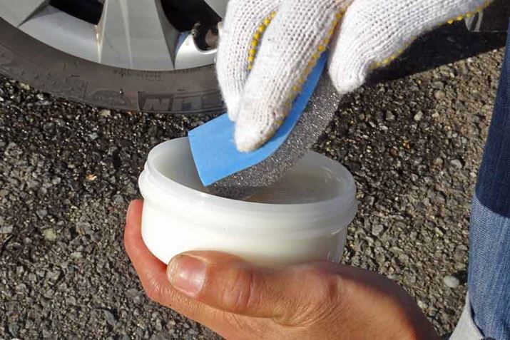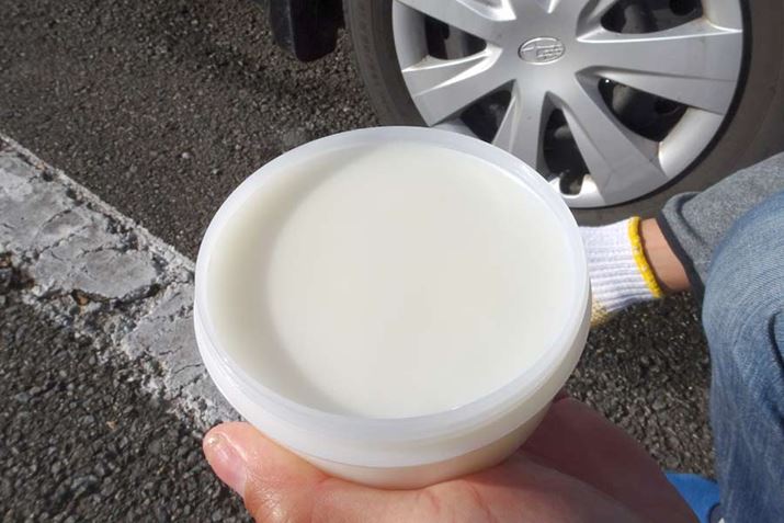 付属のスポンジに塗り込みますが、実施した日はマイナス1度ぐらいの寒い日だったので、ほとんど固形化していました