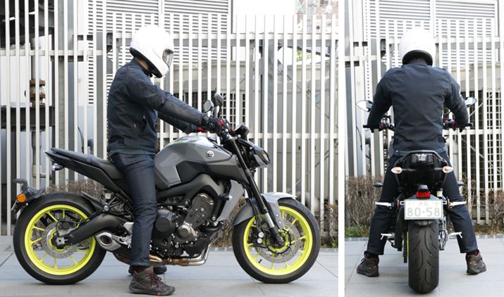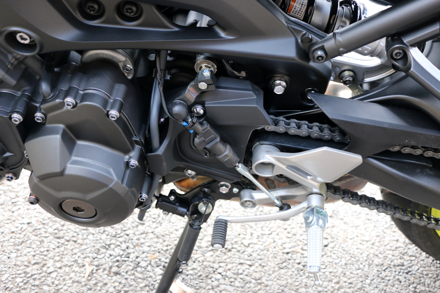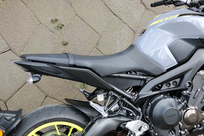 バイクの向きが逆で申し訳ないが、「XSR900」と比べると「MT-09 ABS」は着座位置が前寄りになっていることがわかる。シートがこのクラスにしては細身なのと、サスペンションの沈み込みが大きいため足付きは良好