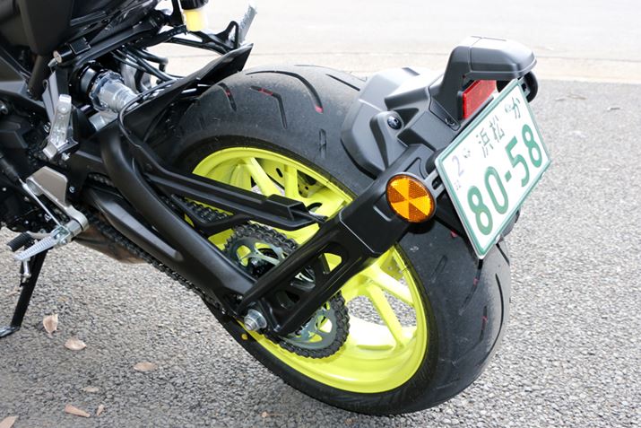 ヤマハ初の片持ち式を採用したナンバープレートホルダーは、デザイン的にもインパクトが強くなった。コンパクトなマッドガードも搭載され、泥除けとしても機能する