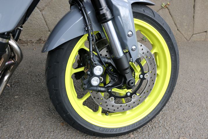 フロントタイヤは120/70ZR17で専用開発のラジアルタイヤを装備。ブレーキは剛性の高さに定評のあるラジアルマウントタイプのキャリパーを採用している。サスペンションもオンロードモデルとしては、よく動くセッティングだ