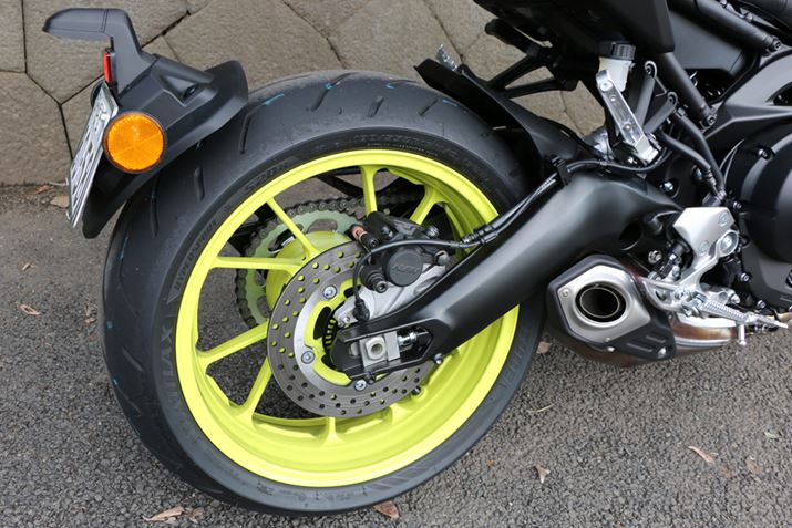180/55ZR17サイズのリアのタイヤにはピンスライドタイプのシングルディスクのブレーキを搭載。リアサスはやややわらかめのセッティングとなっており、湾曲したスイングアームがデザイン上のいいアクセントとなっている
