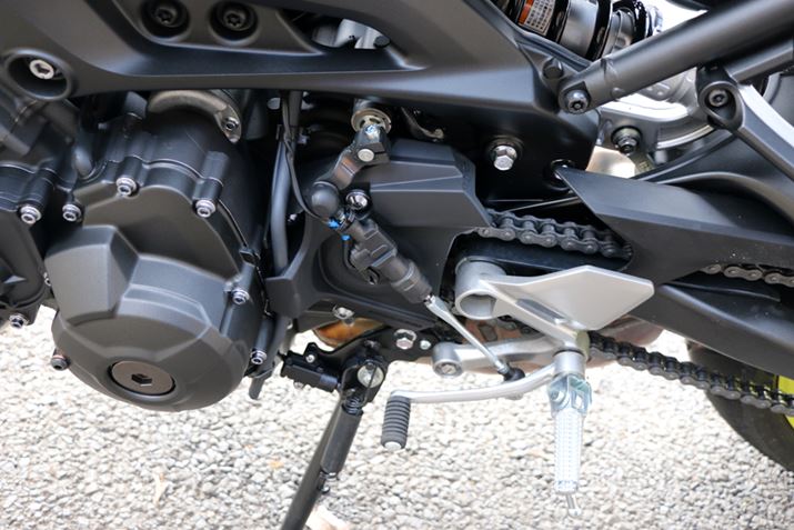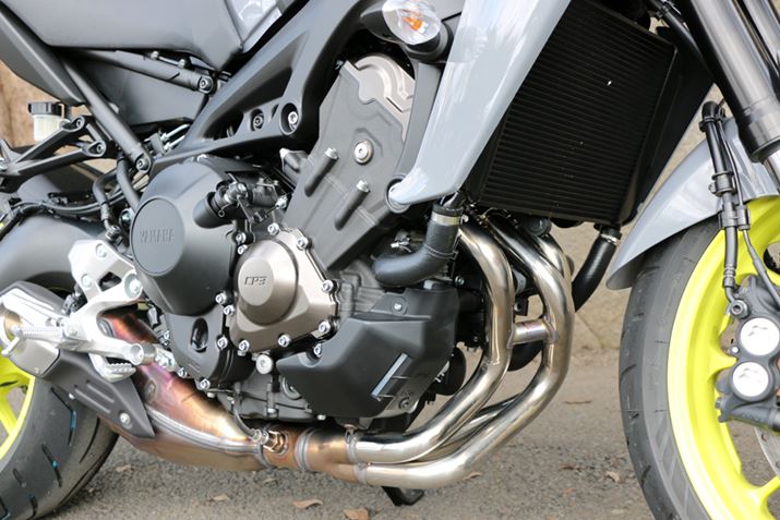 ここまでデザインを中心に見てきたが、マシンの性能を左右する動力についても触れておきたい。「MT-09 ABS」はこのクラスのバイクに多い4気筒エンジンではなく、「クロスプレーン・コンセプト」に基づいた3気筒エンジンが採用されている。「クロスプレーン」とは、もともとレース用の4気筒エンジンに採用されていた機構で、4気筒を不等間隔で爆発させることでトラクションを向上させていたもの。その特性を3気筒で再現した「MT-09 ABS」のエンジンは、4気筒に比べるとコンパクトでトラクション(エンジンの駆動力を路面に伝える能力)にすぐれる。