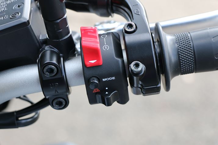 「D-MODE」の切り替えは右手側のボタンで操作。もっともパワフルな「A」、標準的な「STD」、マイルドな「B」と、3つのモードに応じてエンジンパワーやアクセル操作へのレスポンスが変更できる