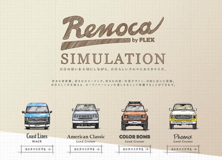 Renocaは、FLEXが得意とするトヨタ「ランドクルーザー」および「ハイエース」を対象にしたカスタマイズサービスだ。クルマのカスタマイズサービス自体は特に珍しいものではないが、Renocaは、Webページから、対象となる3車種4メニューを選び、インテリアやエクステリア、オプションパーツといったカスタマイズ項目を選ぶことで、見積もり価格まで算出される。見積もりの結果は、必要であれば店舗まで転送され、そこからさらに詳細なカスタマイズの指定も可能。なお、外装のカスタマイズに使われる素材が、一般的な強化樹脂プラスチックのFRPではなく鋼板なのも特徴で、より高い強度を備えつつ、柔軟なデザインに変更できるのも魅力だ。