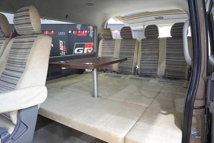 展示車のインテリアは、クロスとレザーのコンビネーションシートに、テーブルを組み合わせた8人乗り仕様になっていた