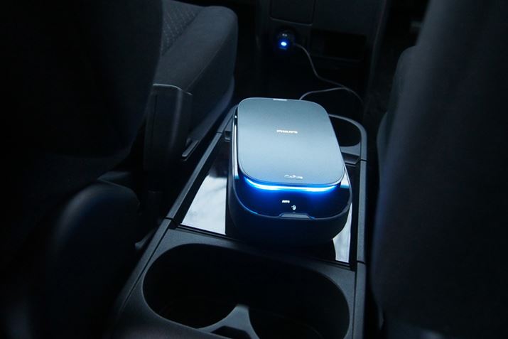 基本的な構造や性能がわかったところで、Philips GoPure Slimline 230を筆者の自動車に設置してみることに! Philips GoPure Slimline 230には設置のためのアタッチメントが複数同梱されており、運転席・助手席のヘッドレスト背面やドリンクホルダーなど、比較的、好きな場所に配置できます。電源を取るためのケーブルは長さ3.87mほどだったので(筆者測定)、後席近くに置くことも可能。