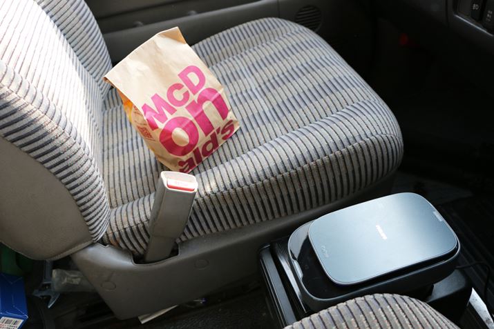 公平を期すため、異なる日に2回検証を実施。強いニオイを発する飲食物を3分間車内に放置したあと取り出し、Philips GoPure Slimline 230を稼動する、停止したままでニオイの残留を確かめました