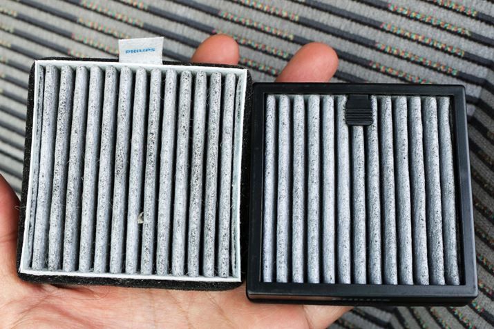 5か月間使用したフィルター(左)と新品(右)を比較してみると、使用したフィルターはほんのり黄ばんでおり、ゴミやホコリが付着していました