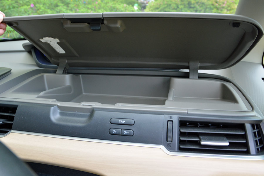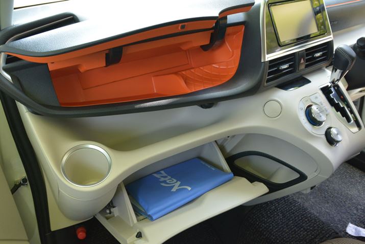 ダッシュボードの、ハンドルとメーターの間のスペースにまで収納が用意されている