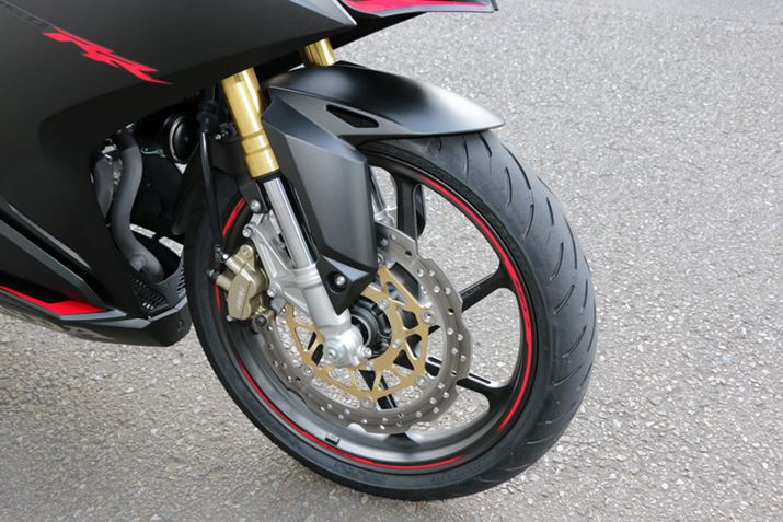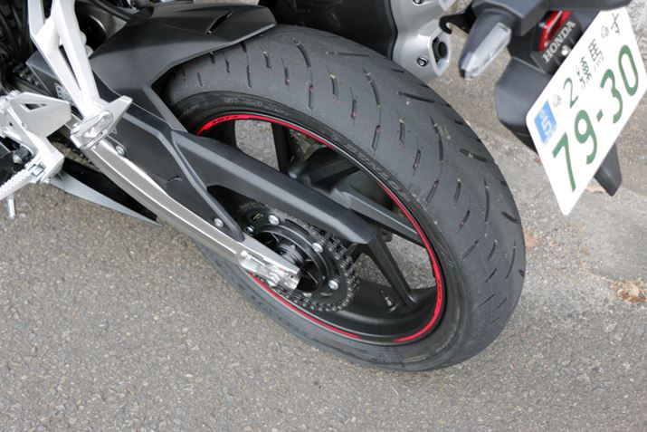フロント110/70R17、リア140/70R17サイズのラジアルタイヤを装着。剛性が高く、ハンドリングの向上などに貢献する