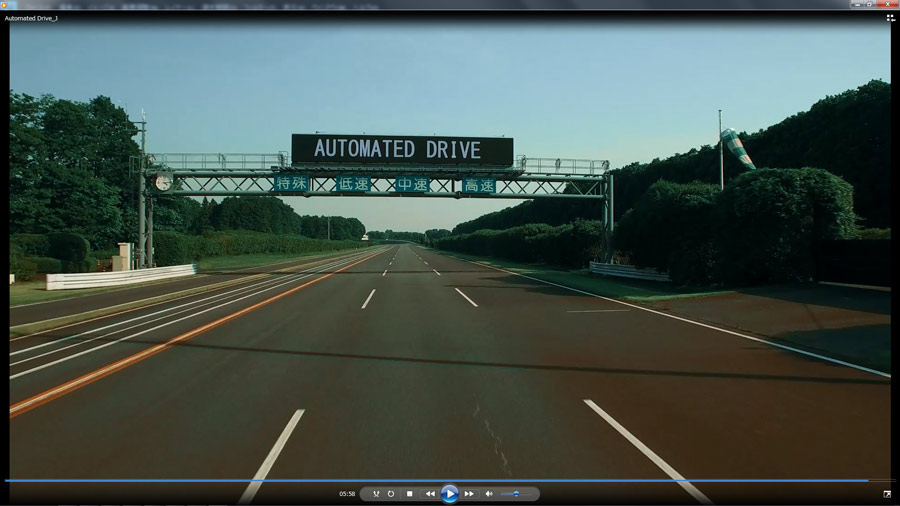 自動運転車の試乗デモは、テストコースの周回路で実施された。4車線以上もある大きなコースだ。スタート地点から、本コースに合流する直前に自動運転モードに入れる。ステアリングのスイッチを押すだけで、難しいことはなにもない。ステアリングの上が青く光って、自動運転モードに入ったことがわかる。本コースに入ると、先行車がいるが、それを自動のまま車線変更してパス。その間も、ドライバーは何も操作せずに見ているだけであった。