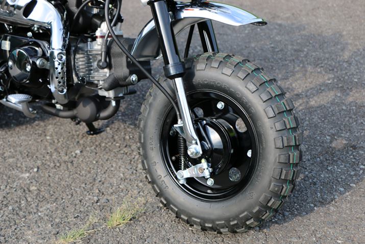 フロントタイヤには、8インチのブロックタイプを装着。メッキの車体を引き立てるように、ホイールは黒で塗装されている