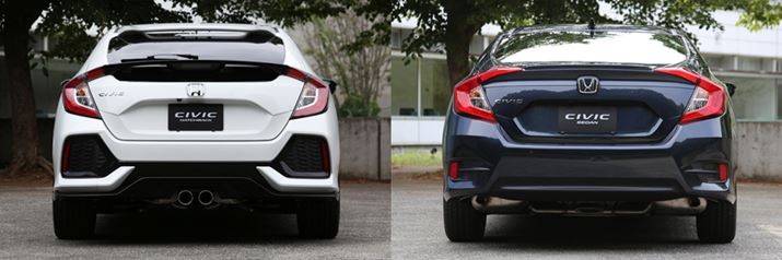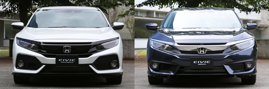 (左)シビックハッチバック/(右)シビックセダン。デザインは似ているが、フロントとリアのバンパーは、ハッチバックのほうが少し派手だ