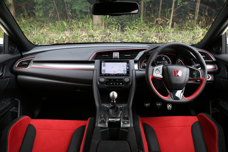 カーボン調パネルと赤ストライプの組み合わせで、質感高く仕上げられた新型シビックタイプRのインパネ。センターコンソールには、シリアルナンバー入りのアルミ製エンブレムが装備される