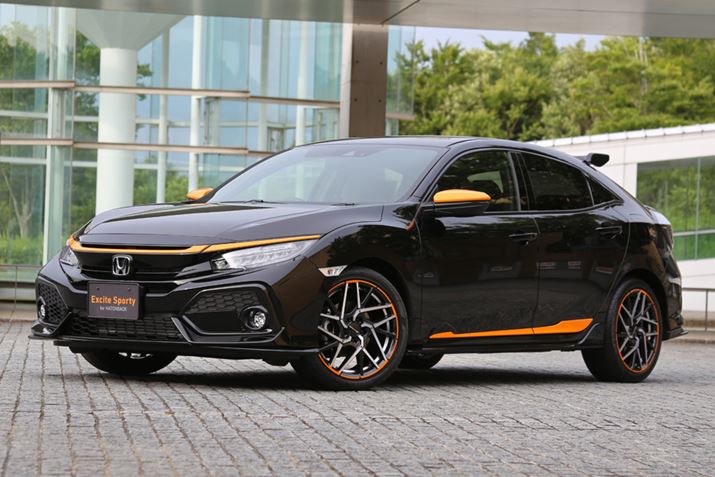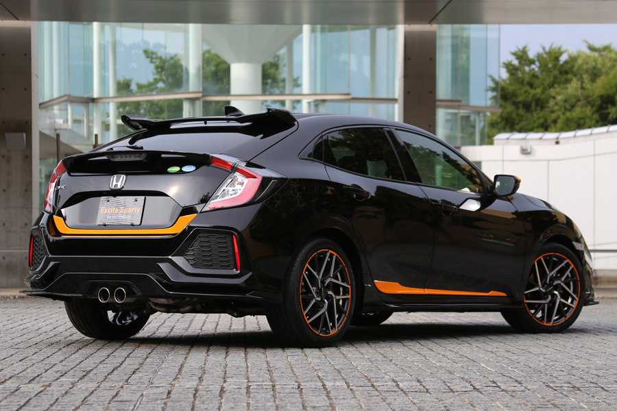 ホンダアクセスの純正アクセサリー「エキサイトスポーティパッケージ」装着車。フロント、リア共にオレンジのアクセントカラーが映えるほか、凝った造形のホイールが印象的だ