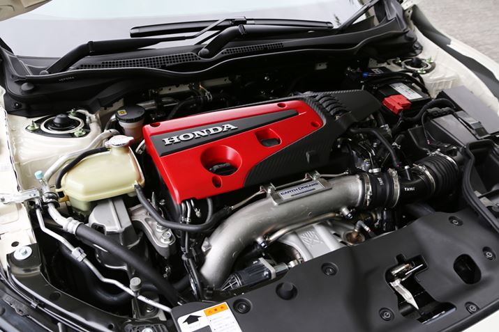 シビックタイプR専用の2リッターVTECターボエンジンは、先代から10PSアップとなる、最高出力235kW(320PS)/6,500rpm、最大トルク400N・m(40.8kgf・m)/2,500〜4,500rpmを発生。エンジンカバーには、シビックタイプRのアクセントカラーである赤が採用されている