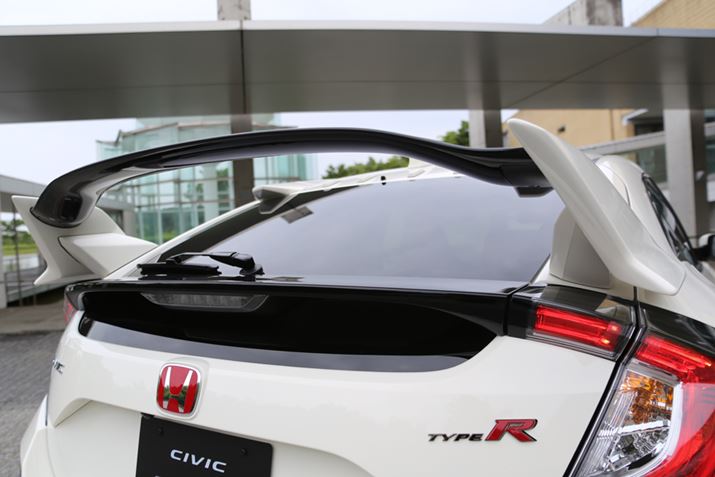 新型シビックタイプRのリアビュー。薄型のリアスポイラーは空力向上のほかに、後方視界にも配慮されている