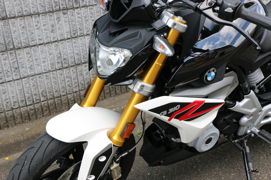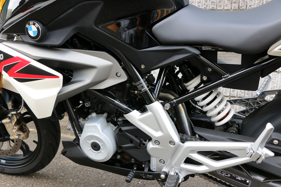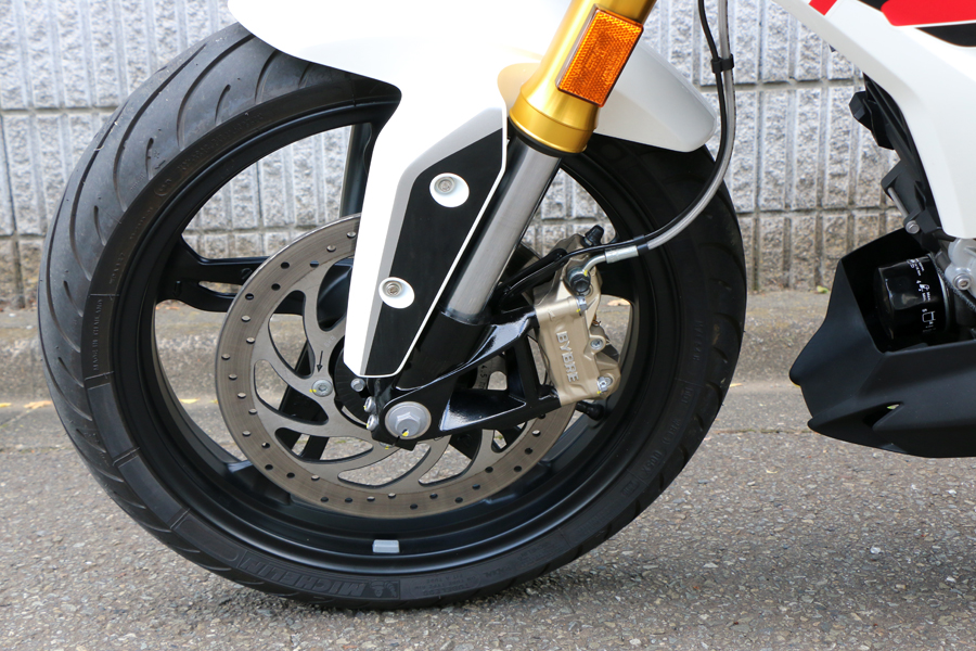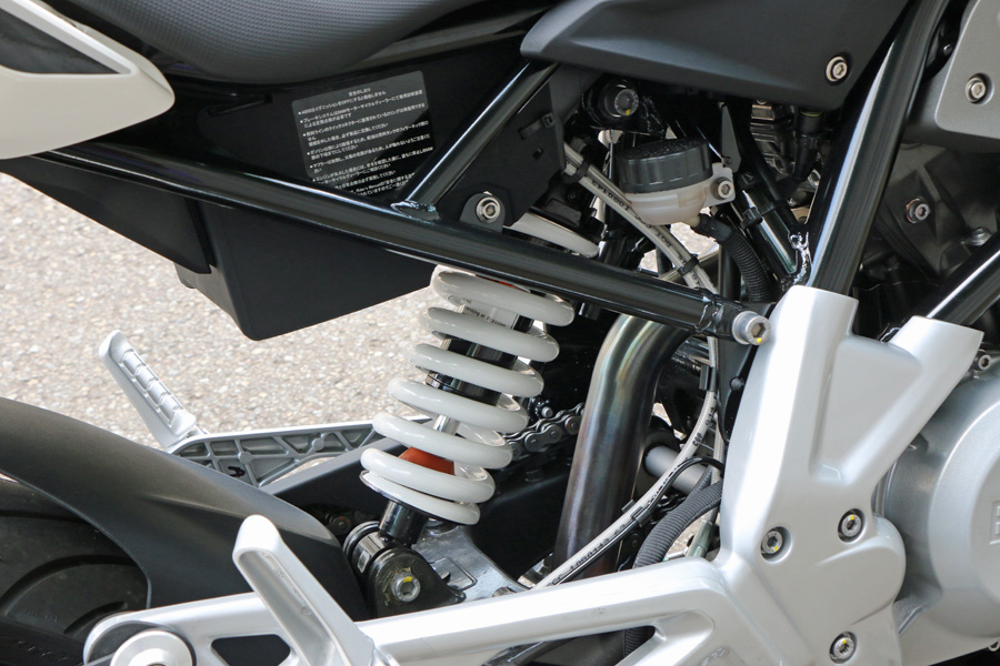 単気筒のエンジンに対して、⾞体はかなりしっかりとしている。これは同社の⼤排気量マシンにも共通する特徴で、エンジンパワーに対して車体が勝っている設計。G310Rではその傾向がさらに顕著になった。特にブレーキは好印象。シングルディスクながらラジアルマウントされたキャリパーは高い制動力を持ち、タッチやコントロール性もすぐれているため、313ccのエンジンが生み出すスピードをすべて右手で制御できる。強く握ればしっかりと車速が落ち、その幅も意のままにコントロールできるので、コーナーに入る前に最適なスピードに持っていきやすい。また、車体の剛性が出力に勝っているため、コーナリングでも安定感はバツグンだ。