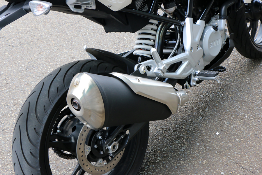 なお、G310Rは成長著しいアジア市場を視野に入れた世界戦略車とされており、多くのユーザーが手軽に乗れるように排気量も価格も抑えられている。58万円(税込)でBMWブランドのバイクが手に入れられる点は、大きな魅力だろう。とはいえ、車両を見るとコストを抑えるために手を抜いたという印象は受けない。心臓部となるエンジンは313ccの単気筒だが、前方から吸気し、後方から排気するという通常とは逆のレイアウトを採用。このレイアウトにより、吸気から排気への流れが適正化されるほか、シリンダーを後傾させ、重心位置を下げることが可能となったことで安定性の高いライディングを実現した。また、倒立式のフロントフォークや軽量化された長いスイングアーム、ABS付きのラジアルマウントブレーキなど足回りのパーツにもコストカットの跡は感じられない。