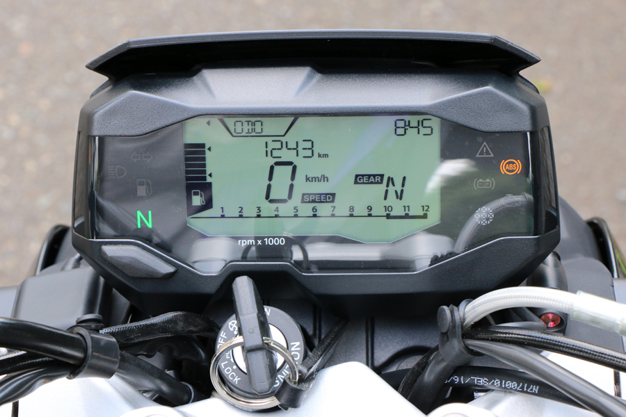 メーターはフルデジタルで、下部にバーのように回転数が表示される。油温やガソリン残量、航続可能距離、平均燃費、平均速度なども確認可能