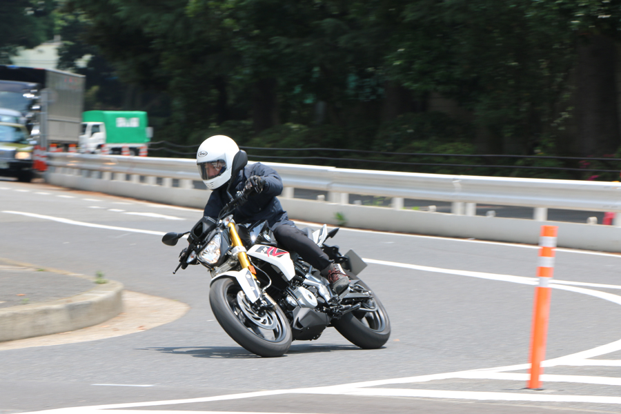 特に楽しかったのは、コーナリング中の自由度の高さ。上半身を立ててバイクだけを寝かすようなリーンアウトや、逆に上体を内側に入れるリーンインなどさまざまな姿勢で街乗りしてみたが、どんな乗り方をしても受け止めてくれる安心感がある。コーナリング中にラインや姿勢を変える操作をしても不安感がないのは、⼩排気量であってもさすがはBMWのバイクだと感じた。