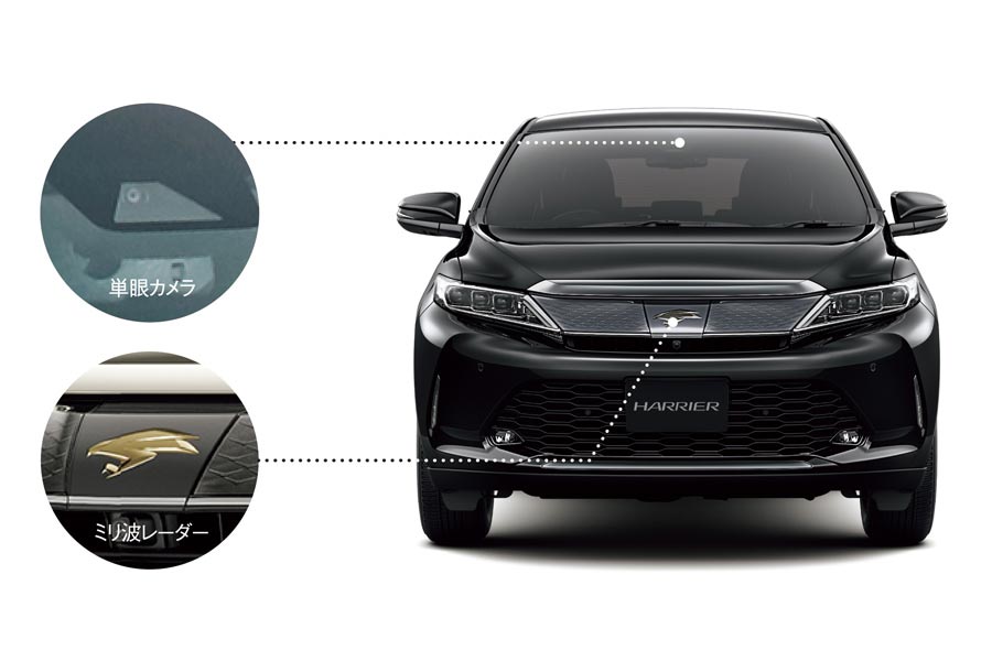 ハリアーには、トヨタで高い安全装備を誇る「トヨタ セーフティセンスP」を標準装着している。ミリ波レーダーと単眼カメラをセンサーに使うことで、車両に加えて歩行者の検知も可能としている。衝突の危険が生じた時にはドライバーに警報を発し、回避操作が行われない時は緊急自動ブレーキを作動させる。