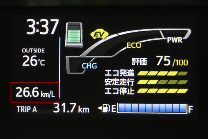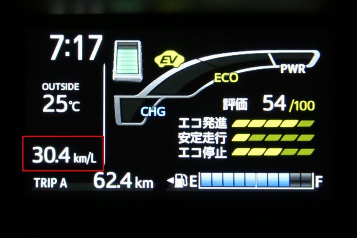高速道路では、途中の府中までは「28km/L」あたりで推移していたが、途中で事故渋滞となり、十キロ以上にわたって時速30kmあたりで一定のノロノロ運転となったために燃費が伸び始め、結果としては「30.4km/L」という実燃費になった。渋滞がなければ、おそらく28km/Lあたりの燃費値だったのではと考えられる。
