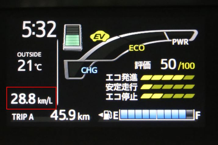 郊外路のルートでは、信号のない平坦な快走路ではおよそ「28km/L」。高尾山の付近と道志みちの付近の上り下りのあるワインディングでは、上りに入ると燃費はガクッと落ちたものの、下りではBレンジを積極的に使うことでEV走行の時間が増えたため燃費が回復し、「28.8km/L」という実燃費結果となった。