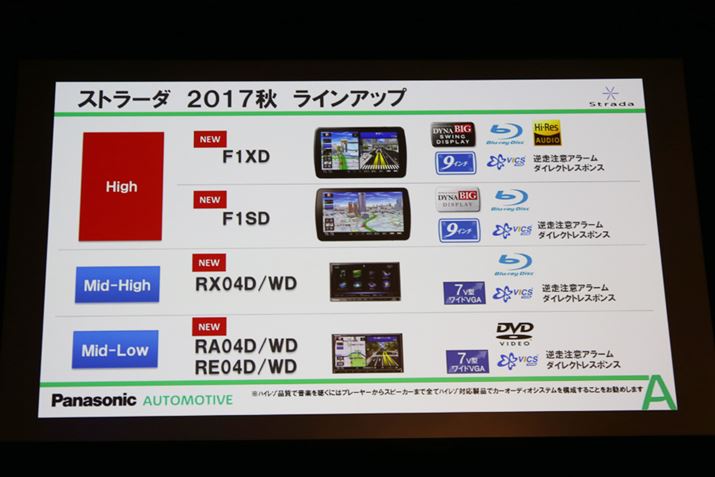 パナソニックは、2017年9月4日に開かれた「2017年・秋 ストラーダ新製品発表会・内覧会」において、フローティング構造を採用することで多くの車種へ大画面の装着を可能とした9インチ SDカーナビゲーション「CN-F1D」の新モデルとして、「CN-F1XD」「CN-F1SD」を発表した。