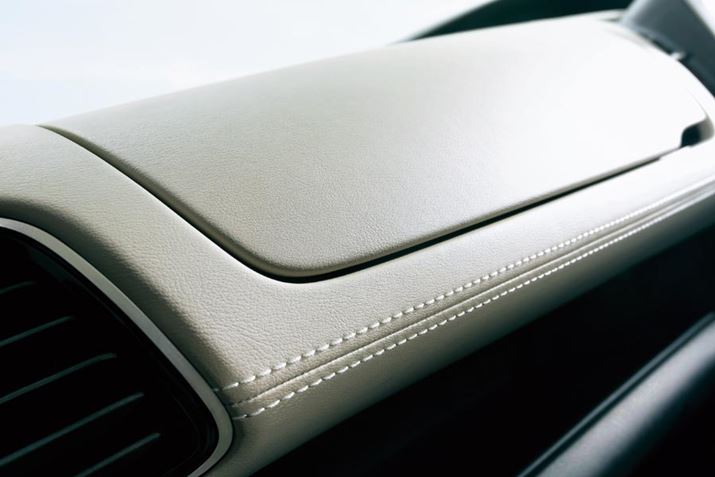 日産「セレナ」のインパネ。ホワイトの合成皮革にステッチが採用されていることなどによって、質感が高められている