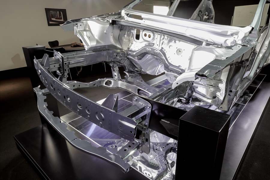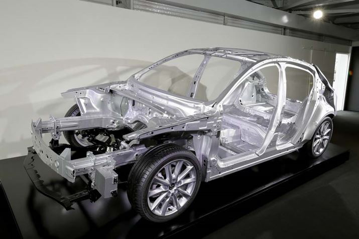今回の試作車の採用するシャシーは、開発途中の「スカイアクティブ・ビークルアーキテクチャー」を採用。「多方向環状構造」という考え方に基づき、力の伝わり方まで考慮されている