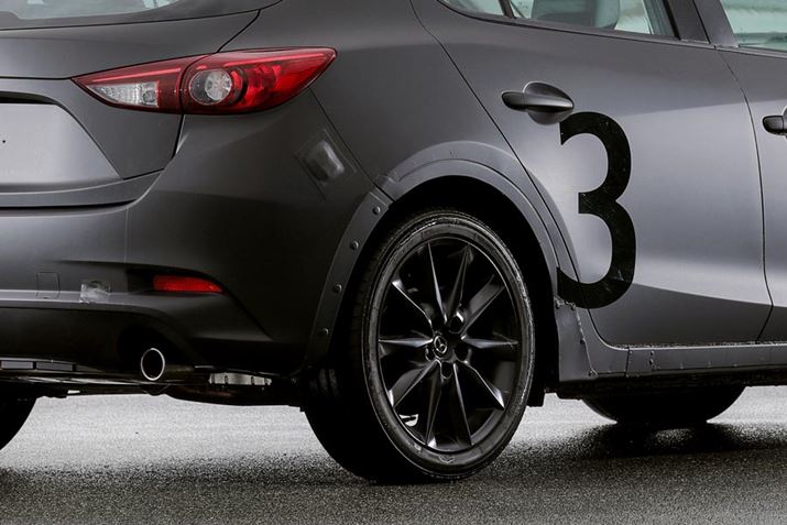今回の試乗車は、マットブラックに塗装された「アクセラ」ベース。エンジンとボディが新開発で、現行モデルとは中身はまったくの別もの