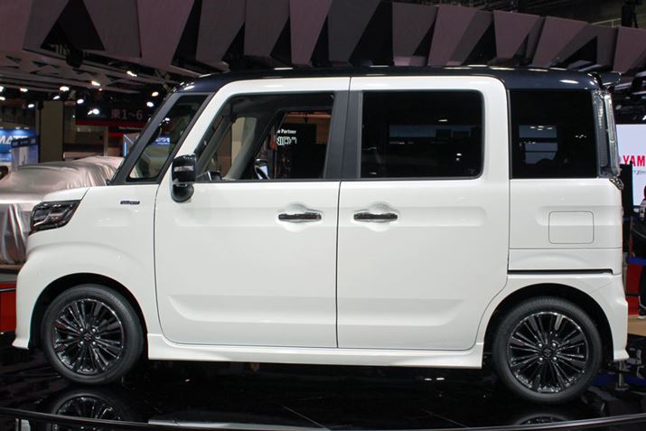 「スペーシアカスタム コンセプト」を横から見たところ。Cピラーの後方がブラックアウトされており、ぱっと見たシルエットは、小さな荷台のあるピックアップトラックのようだ