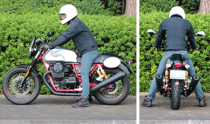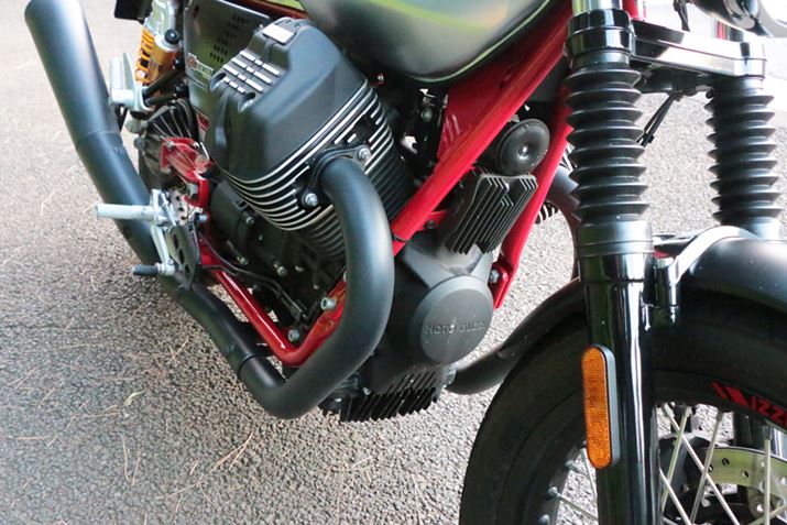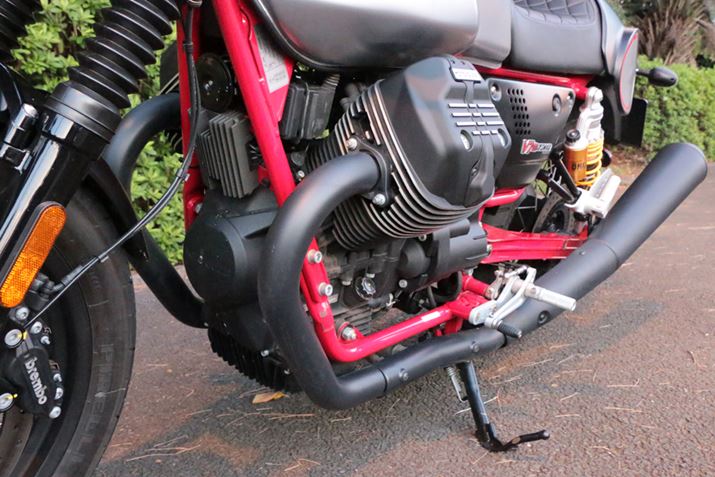 シリンダーが車体両側から斜め上に向かって突き出した状態は、ひと目見ただけでモト・グッツィのバイクだとわかる