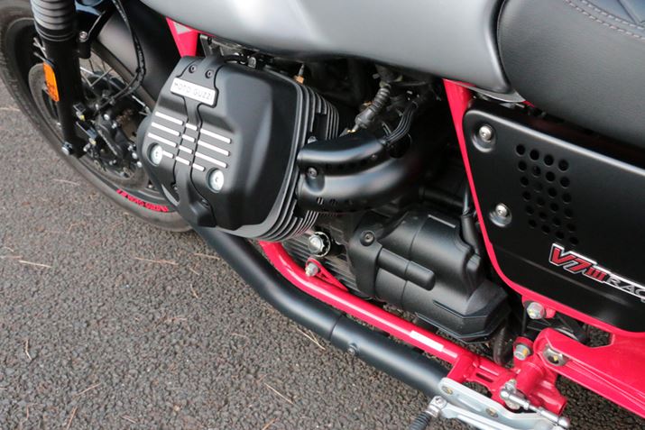 縦置きV型2気筒エンジンのレイアウトを継承しているものの、前モデルの「V7 U」と比べると多くの部分が新設計となっている。アルミニウム製のヘッドやピストン、シリンダーは刷新され、Vツインエンジンの存在感がさらに際立つものとなった。排気量は前モデルと同様(744cc)だが、馬力は48PSから52PSにアップ。新しい排気システムを採用することで、より厳しくなった「ユーロ4」の排ガス規制にも適合している。また、個性のひとつであるシャフトドライブの駆動方式も健在。しかし、後輪のスリップを防止するトラクションコントロールシステム「MGCT(モト・グッツィ・トラクション・コントロール)」を搭載したり、ブレーキにABSを採用するなど、見た目はクラシックだが、安全性については現代的な最新技術でカバーされている。