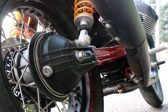一般的なチェーンドライブではなく、シャフトドライブを採用。また、リアには大き目のディスクブレーキが装備されている