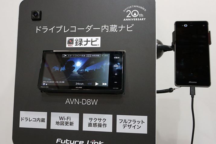 11月上旬に発売されたデンソーテンのドライブレコーダー付きカーナビ「録ナビ」シリーズの2018年モデル「AVN-D8」。同梱のカメラを設置するだけで、ドライブレコーダーとして利用できるのが特徴。別売りのバックカメラで後方の記録にも対応する