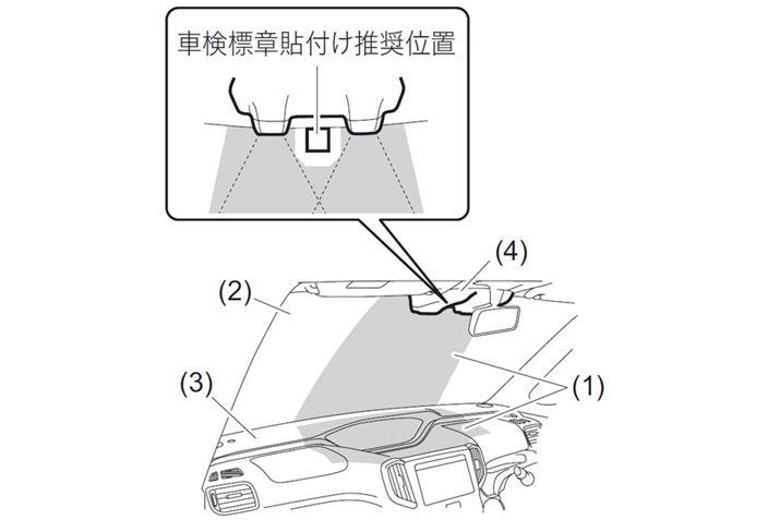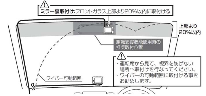 道路運送車両法により、ドライブレコーダーなど事故の状況に係る情報を入手するためのカメラは、フロントガラス上部から「20%」以内の範囲、もしくはフロントガラス下部から「150mm」以内の範囲への設置が定められています。画像は、コムテック ドライブレコーダー「ZDR-015」のマニュアルより抜粋