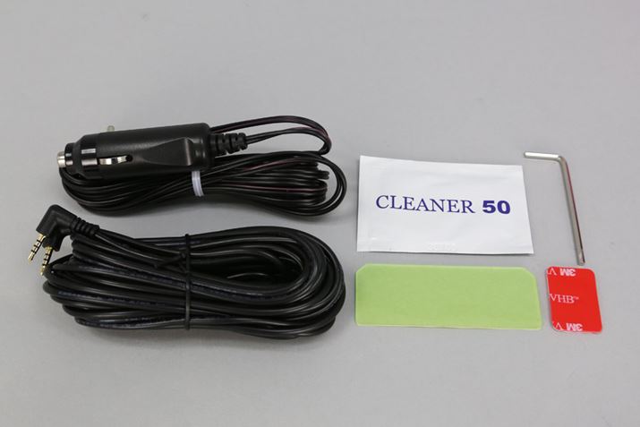 コムテック ドライブレコーダー「ZDR-015」の付属品。(左上)「シガープラグコード」[約4m・1Aヒューズ内蔵]/(左下)「カメラケーブル」[約7m]/(中央上)脱脂クリーナー/(中央下)フロントカメラ固定用両面テープ/(右上)2.5mm六角レンチ/(右下)リアカメラ固定用両面テープ