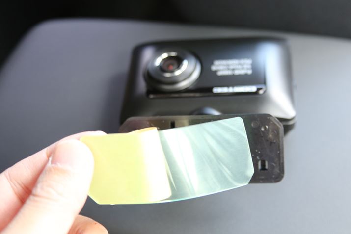リアカメラの設置場所と角度が決まったら、フロントカメラと同様に脱脂クリーナーでガラス面をきれいにしてから、付属の両面シールを使って貼り付けます。