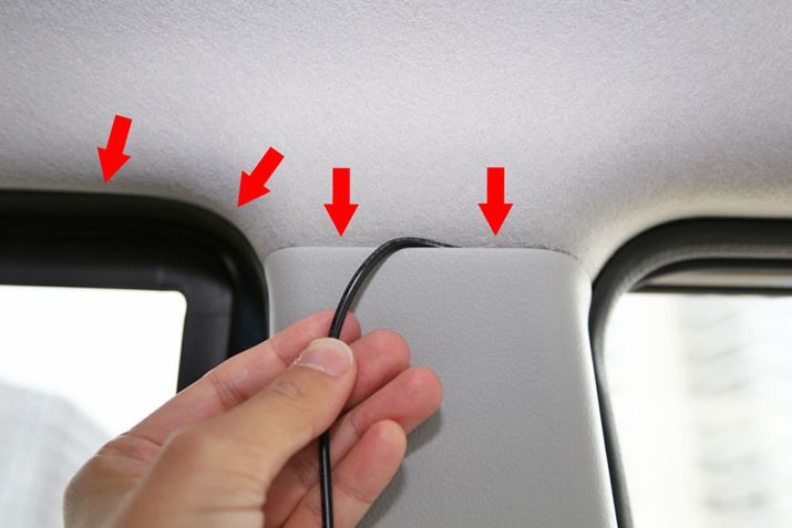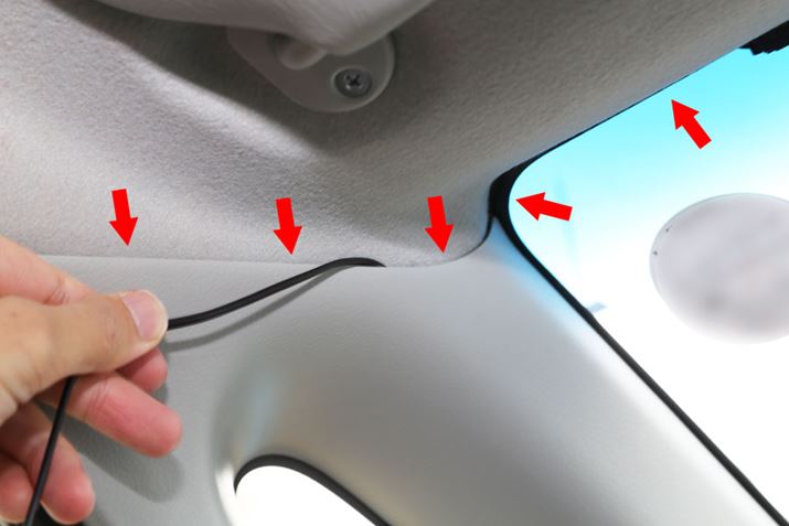 普段はあまり触れることのないフロントガラス上部と天井のすき間は、実は大きく開いておりケーブルはかんたんに押し込むことができます