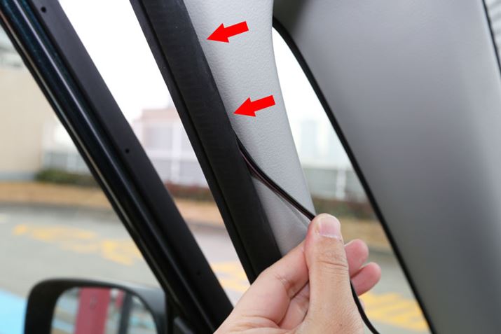 Bピラーは、Aピラーと同様にカバー裏へと押し込みます。後席ドアも、助手席ドアと同様にウェザーストリップ裏に配線を隠しながら、リアへと引き回していきます。