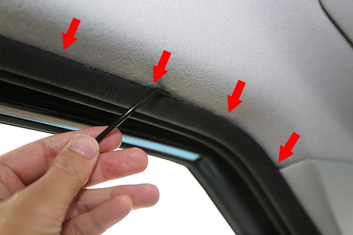 次に、カメラケーブルをリア側へと引き回します。カメラケーブルは、助手席ドアの上部のウェザーストリップ裏に押し込みながら、後席ドアのほうへとつたっていきます。