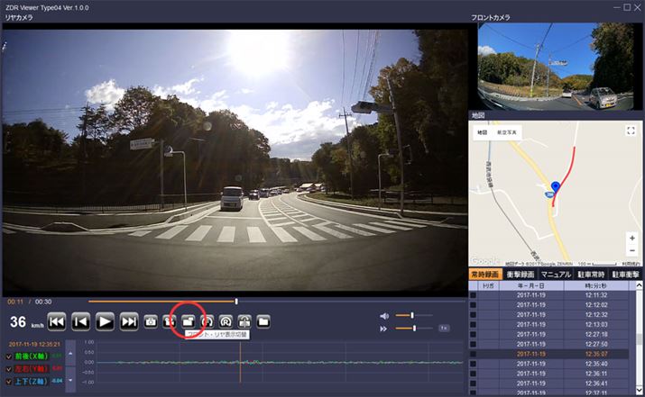 さらに、赤丸のボタンをクリックすれば、再生しながらフロントカメラとリアカメラを瞬時に切り替えることもできます。