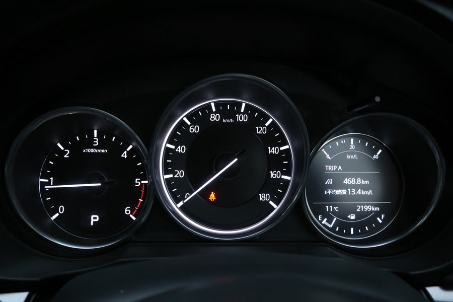CX-8のインパネなどの内装は、CX-5をベースにしながら上質に仕上げられた。メーターはサイズが大きめで、視認性がよい。水平基調のインパネデザインによって、操作性もすぐれている。