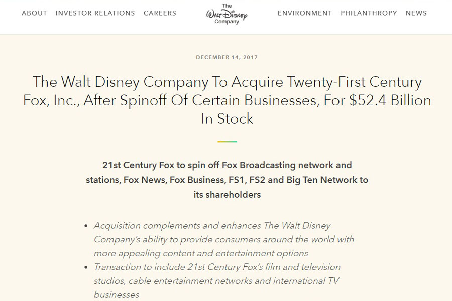 2017年12月14日、ウォルト・ディズニー・カンパニーは21世紀FOXの映画およびテレビ部門を524億ドルで買収することを発表しました。21世紀FOXの負債も引き受けるため、総取引額は約661億ドル、日本円にして約7.4兆円にのぼります。
