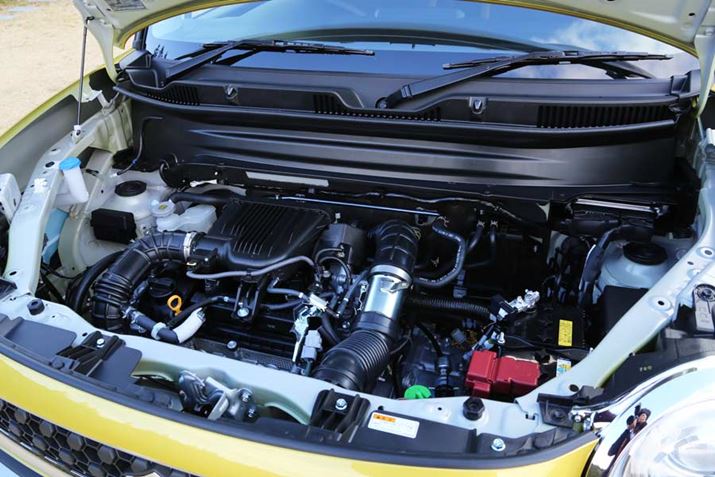スズキ「クロスビー」のエンジンルーム。エンジンは、スズキ「スイフト RSt」と同様の「1.0L直3直噴ターボエンジン(K10C型)」が搭載されている